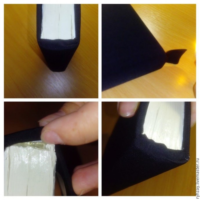 Займемся оставшимися обрезами у корешка книги. Обжигаем зажигалкой края, чтоб не бахромились. Заворачиваем ткань плотной трубочкой и фиксируем клеевым пистолетом.