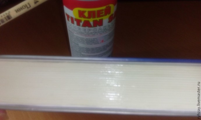 Как дошли до дна (я оставила пару страничек в конце), проклеиваем обрез изнутри. Также двигаемся вдоль.