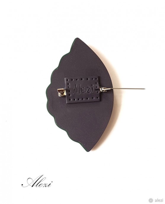 Отправляем запекаться. После запекания, я шлифую изделие и прикрепляю при помощи термоклея основу для броши. Опять отправляю запекаться.