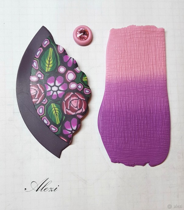 С одним цветочным принтом оставлять брошь мне было слишком скучно. Поэтому положив сделанную форму на подготовленный нижний пласт, я добавляю слой полимерной глины с плавным переходом от розового к фиолетовому.