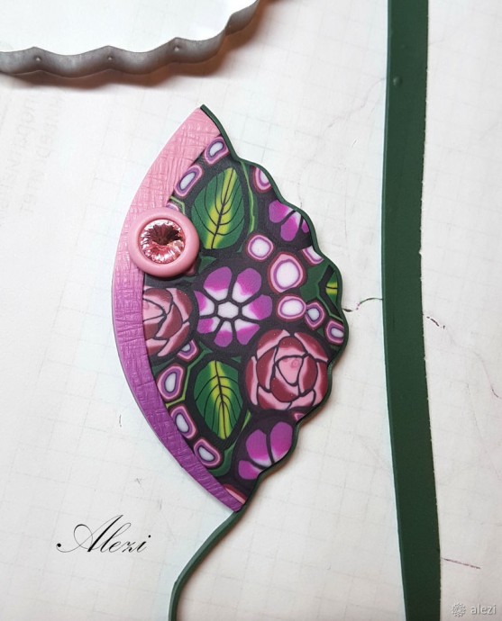 Начинаем вырезать брошь. При помощи каттера для цветов один край я делаю волнистым (если каттера нет, то его можно оставить гладким, просто сделать полукруглым). Подготавливаю маленький кристалл Сваровски.