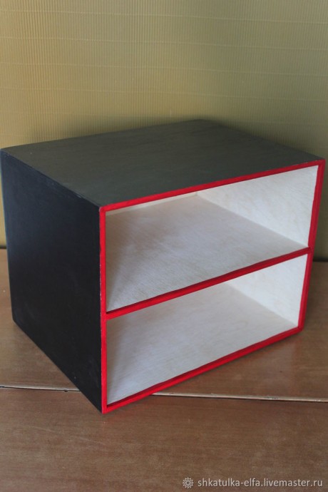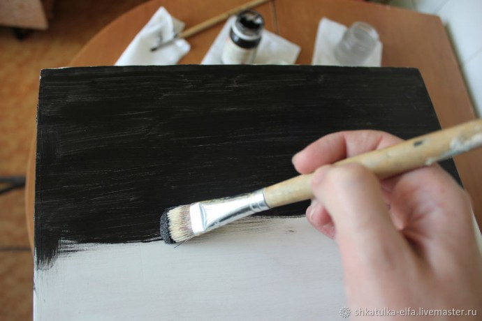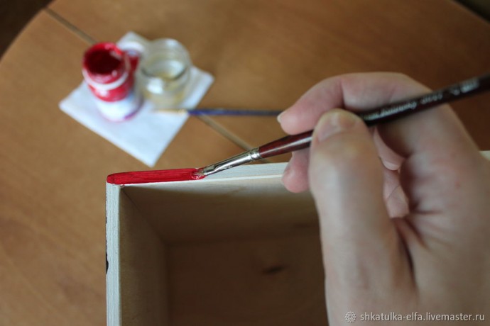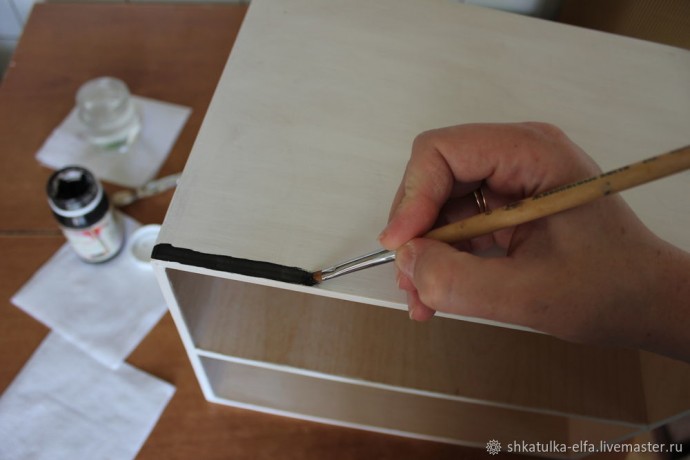 Тонкой кисточкой аккуратно прокрашиваем красной краской торцевые части комодика. Ребро между черной и красной сторонами должно быть очень ровным — думаю, это самая сложная часть данного декорирования. Можно помочь себе малярным скотчем.