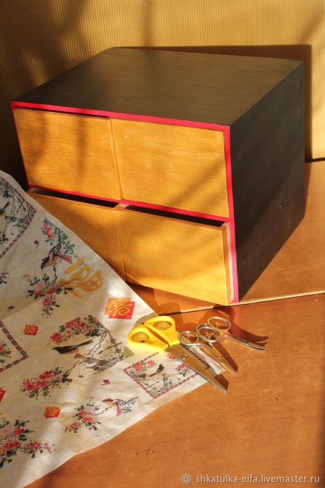 Настольный мини-комод — очень удобная вещь. Хранить мелочи, материалы для рукоделия в таком комодике очень удобно, потому что все ящики имеют небольшие размеры. В плане декора такой предмет мебели может сыграть роль акцента. Например, моей заказчице хотелось добавить нотку Востока. Техника исполнения очень простая. Важно лишь определить характерные черты выбранного стиля.