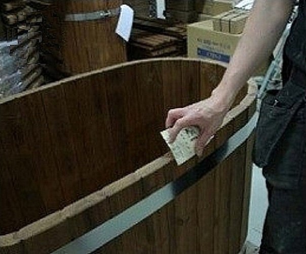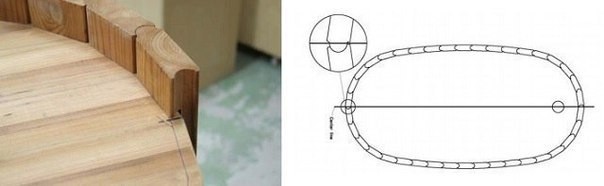 Прежде чем покупать материалы для изготовления купели, необходимо составить качественный сборочный чертеж этой емкости с точными расчетами размеров и количества деталей (рис 1, размер в дюймах!).Рекомендовано выполнить чертеж в нескольких проекциях - тогда легче будет просчитать все параметры необходимых комплектующих – деталей стенок, днища, лестницы.Лестница может иметь ступеньки, как на представленном чертеже, или просто деревянные перекладины. Но в последнем случае, в целях безопасности, необходимо, чтобы приставная лестница зацеплялась за край купели.Доски будут необходимы для стенок и дна купели, подставок под нее, внутренних скамеек и лестницы. Обычно используется материал сечением 20 × 120 мм, с учетом того, что края доски будут фрезероваться. Длина доски будет зависеть от выбранной высоты купели.Для подставок под купель, нужен будет брус 100 × 100 или 150 × 150 мм. Его длина будет зависеть от ширины и длины купели.Кроме досок потребуются металлические полосы и болты, которыми будут стягиваться установленные доски. Металл для полосок нужно выбирать достаточно гибкий, но очень прочный.Для скрепления отдельных деталей дна и прикручивания ножек будут необходимы саморезы. Но нужно учесть и то, что внутри купели не должно быть ни одной металлической детали.Изготовление деталей для деревянной купелиИзготовить деревянные элементы для сборки купели не так просто, как кажется, так как они должны будут создать единую прочную, и в то же время - герметичную конструкцию, которая не будет протекать ни в одном месте. Доски должны плотно стыковаться между собой, создавая цельную, без щелей поверхность на стенках и на плоскости дна. Кроме этого, стенки купели должны быть плотно состыкованы с донной плоскостью.Доски распиливаются на одинаковые отрезки (в соответствии с чертежом), равные высоте стенок плюс 100 ÷ 120 мм. Это расстояние, на которое дно купели поднимется над полом. Нижняя часть досок при этом закроет это пространство от сквозняка.Затем каждая из досок по краям фрезеруется. С одной формируется полукруглый шип, а с другой вырезается полукруглый паз, имеющий точно такой же радиус, как и у шипа - они должны идеально подходить друг к другу.Доски для днища тоже должны быть отфрезерованы под соединение шип-паз без боковых фасок, таким образом, чтобы поверхность пола была идеально ровной и не имела даже маленьких щелей.Другой вариант - доски должны быть ровными, идеально подогнанными, без шпунтованных соединений.Далее, на каждой из досок, предназначенных для стенок купели, от нижнего их края отмеряется одинаковое расстояние, например, в 100 мм. Выше его отмечается точная толщина доски, из которой будет монтироваться днище, например, 25 или 30 мм.На отмеченном участке аккуратно фрезеруется квадратный паз, глубиной в одну треть толщины доски, в данном случае – 8 ÷ 10 мм.Закончив изготовление деталей по рассчитанным размерам, их подвергают тщательной шлифовке. Так, доски для стенок должны быть идеально гладкими с обеих сторон, а детали днища – по меньшей мере с той стороны, которая обращена внутрь купели.Принцип монтажа деревянной купели схож с изготовлением бочек. Разница в этом процессе заключается в форме и толщине деревянных элементов, образующих стенки получаемой емкости. Доски для купели - абсолютно ровные, а для бочки они сужаются к донно