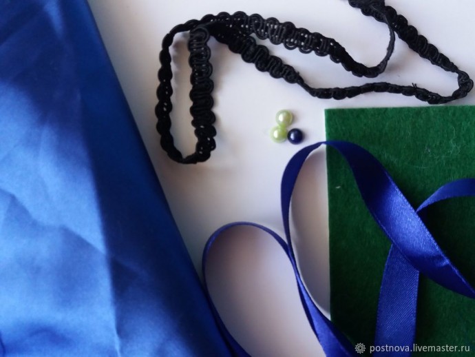 Инструменты и материалы, необходимые для нашего творчества: картон, фетр (один телесного цвета), шелк, синтепон, атласная лента, тесьма, декор (может быть любой — бусины, полубусины, бисер), клеевой пистолет, прочные нитки, зажигалка (для обработки края атласной ленты) и ножницы.