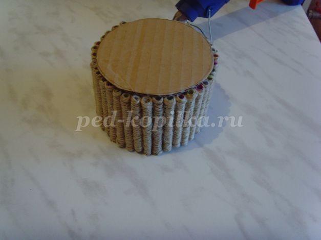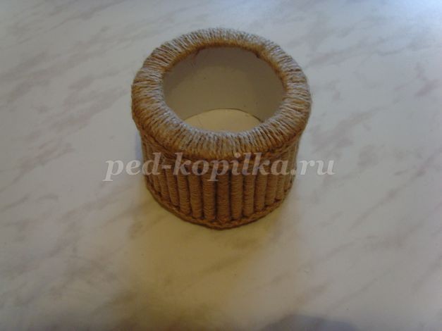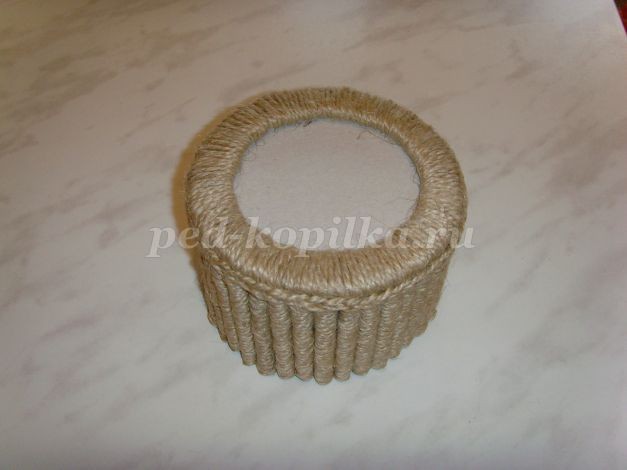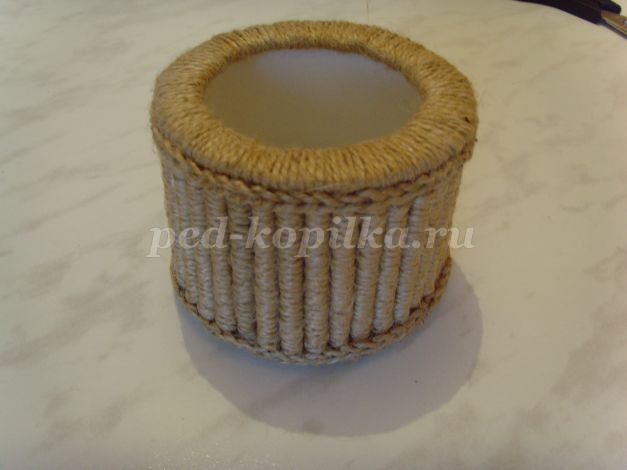 Чтобы скрыть небольшие погрешности, крючком связала из шпагата косичку и приклеила снизу и сверху колодца