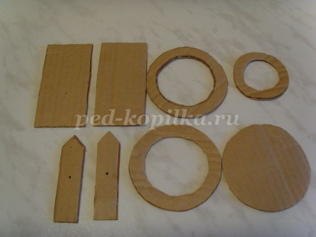 Из плотного картона вырезаем детали: круг диаметром 11 см. - 2 шт. (это будет оформление, чтобы прикрыть трубочки сверху и снизу), круг диаметром равным дну колодца - 1 шт., круг для колеса – 1 шт., прямоугольник 6 Х 12 см. - 2 шт. для крыши, "колышек" высотой 10 см., шириной 2, 5 см. и с дырочкой посередине - 2 шт.