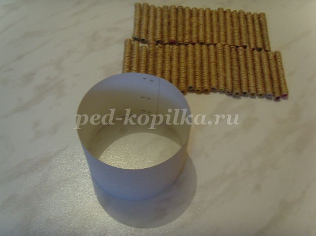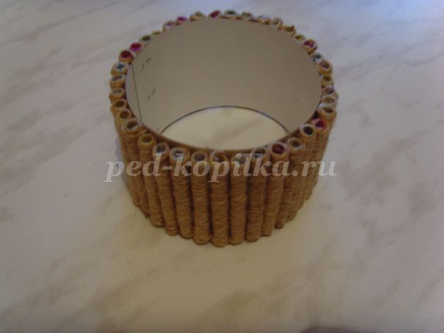 Обматываем круги диаметром 11 см., шпагатом и приклеиваем сверху и снизу колодца