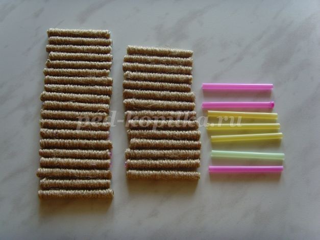 Коктейльные трубочки нарезаем в количестве - 40 шт.- по 6 см. Обматываем шпагатом, закрепляя в начале и в конце клеем