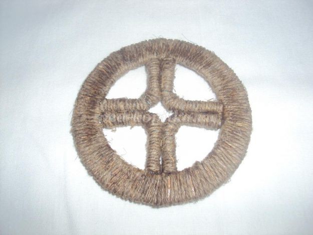 5. Такую конструкцию вставляем в круг из картона, обмотанный шпагатом. Колесо готово. Для велосипеда понадобится 3 таких колеса.