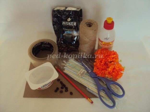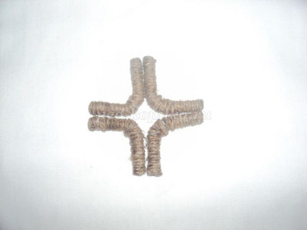 4. 4 заготовки, обмотанные шпагатом, склеиваем между собой клеем «Титан», вот таким образом.