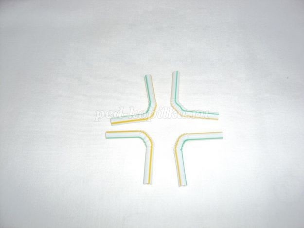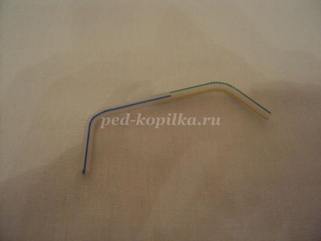 7. Берем коктейльную трубочку, отмеряем 2 сантиметра до сгиба и 3 сантиметра после сгиба, отрезаем. Нам понадобится 2 такие заготовки для руля. Теперь их нужно соединить между собой.