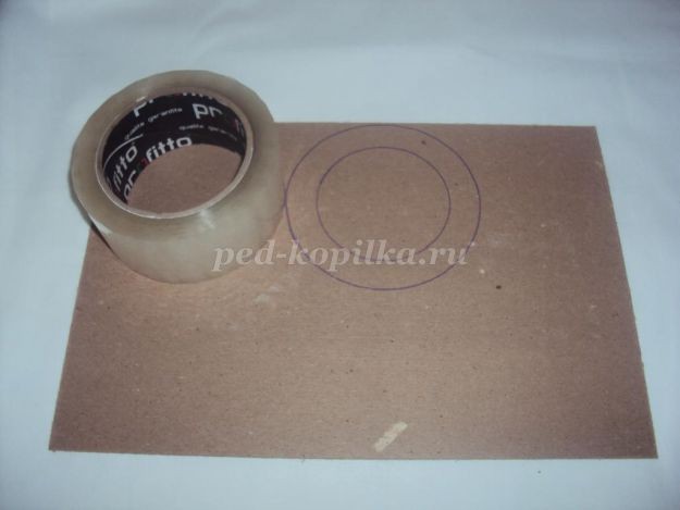 1. Берем плотный картон, прикладываем предмет который очень похож на колесо(например, бобина скотча), обводим, вырезаем. Для одного колеса понадобится 2 детали из картона, их необходимо склеить вместе. Нужно сделать 3 таких основы для колеса.