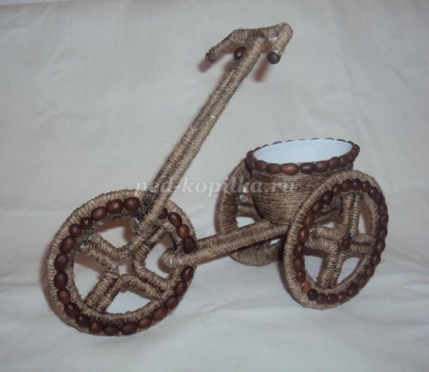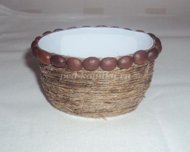 17. Возьмем емкость, которая непосредственно будет выполнять роль кашпо (например от йогурта, сливочного масла). Обматываем шпагатом и украшаем кофейными зернами.
