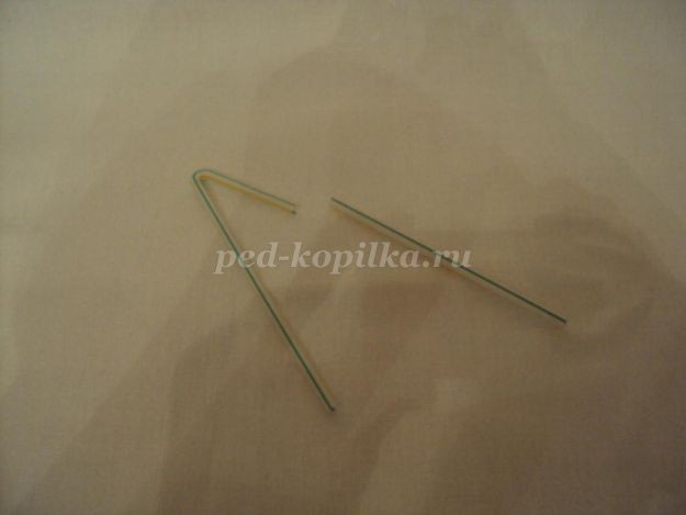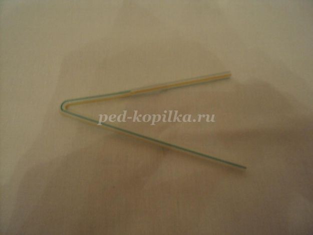 11. Берем одну трубочку, сгибаем и растягиваем там где сгиб. Трубочку с короткой стороны надо надрезать, намазать каплю клея и вставить в нее отрезок, оставшийся от заготовок для колес.