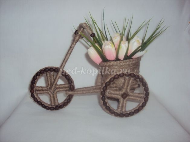 18. Приклеиваем руль и кашпо. Вставляем в кашпо искусственные цветы. Кашпо в виде велосипеда готово.