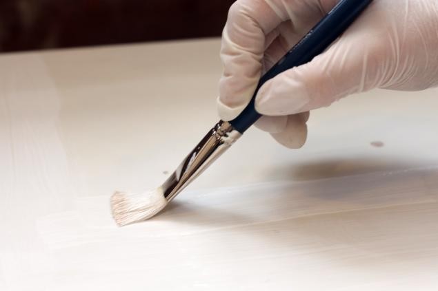 Далее приступаем к обработке. Нам потребуется акриловый грунт и синтетическая кисть. Покрываем поверхность грунтом. Это позволит краске, в дальнейшем, лечь ровно и качественно сцепиться с деревом. Оставляем сохнуть на 30 минут. При нанесении грунта и красок можно использовать резиновые перчатки, но, если они доставляют дискомфорт, можно запросто без них обойтись, так как ни краски, ни грунт для кожи не вредны и смываются теплой водой.