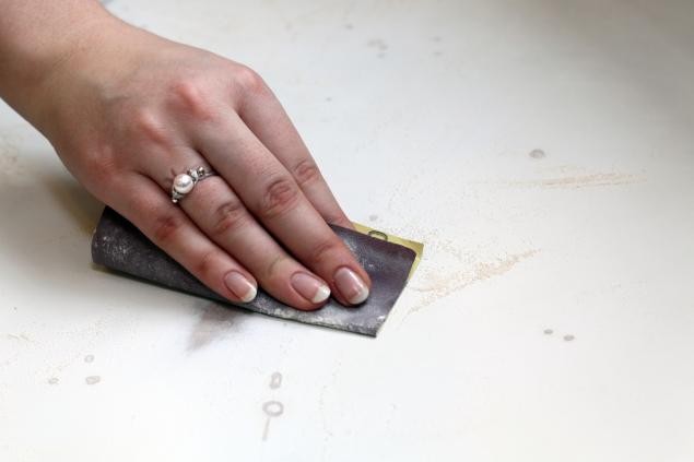 Для начала подготавливаем поверхность. С помощью наждачной бумаги снимаем верхний слой краски со стола и зашкуриваем неровности, чтобы столешница стала идеально-гладкой
