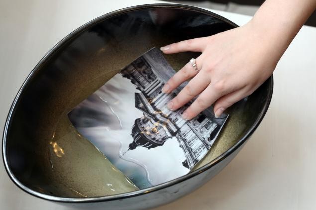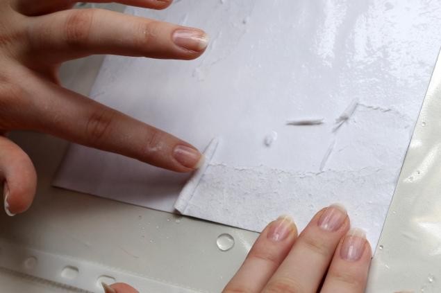 Приступаем к работе с изображениями. Опускаем картинку в воду на 30 секунд, чтобы она размокла, но не развалилась. Кладем лицевой стороной на файл.