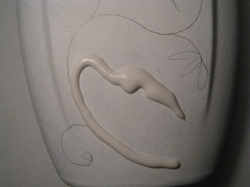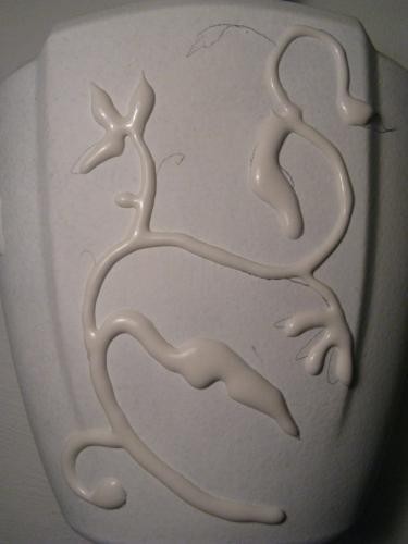 3. Берём бутылочку из под краски для волос. Если узор мелкий то с наконечником от контура. Накладываем мастихином шпатлёвку из ведёрка .Добавляем воды. воды надо чуть-чуть, иначе шпатлёвка будет слишком жидкая. Сколько надо только экспериментальным путём, учитывайте ,что чем больше воды, тем меньше рельеф! Начинаем обводить узор, по "росту" орнамента. Наконечник прижимаем к поверхности примерно под углом 45 градусов.