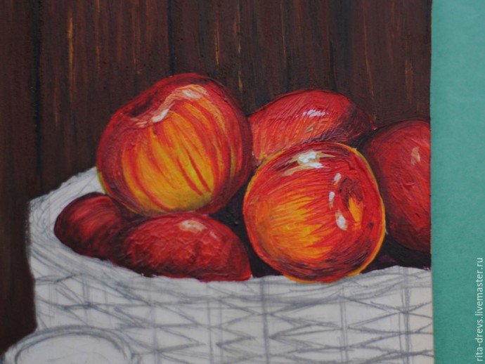 Осталось оживить яблочки бликами. Смесью красного, лимонного и белого обозначаем свет небольшими пятнами по форме яблок, и сверху чистыми белилами накладываем токой кисточкой небольшие блики.