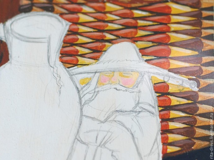 Переходим к Домовому. Закрашиваем лицо смесью охры с белым. Левую часть лица (лево с нашей стороны), кроме глаза, и под правым глазом кладём тень чистой охрой. На щёчки кладём румянец (красный с белым).