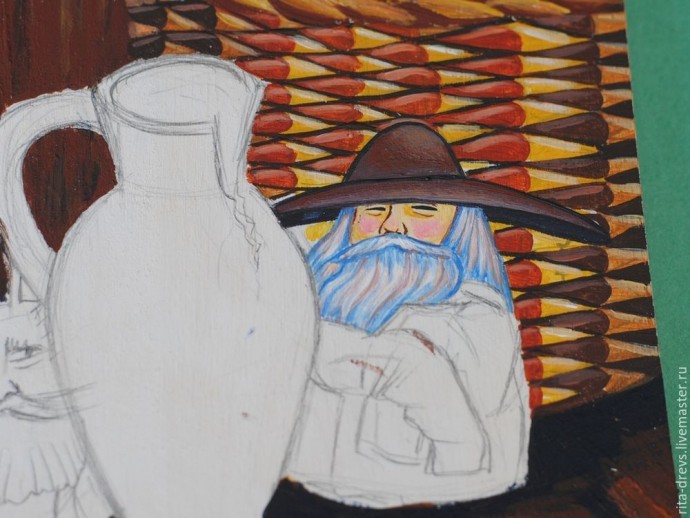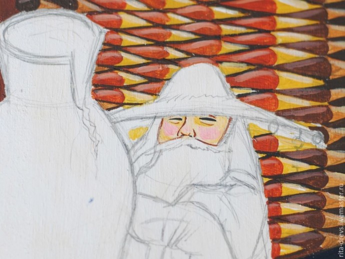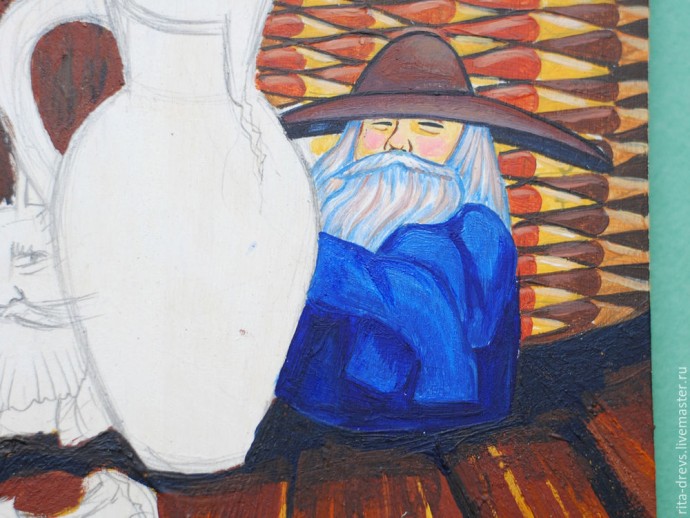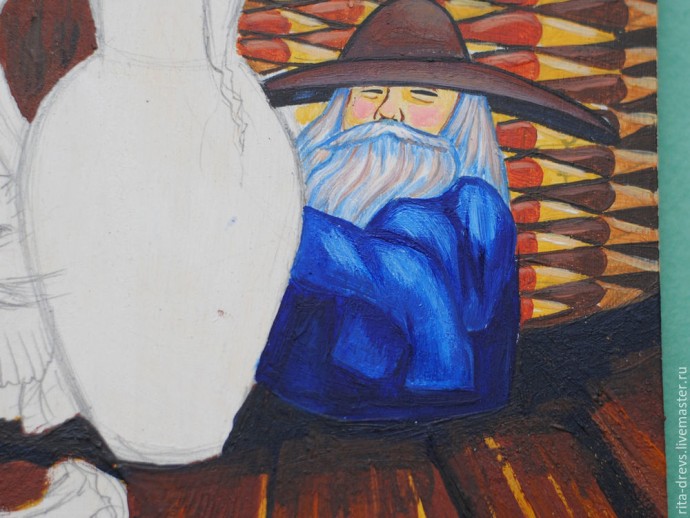 Облачение Домового рисуем чистым синим, а рукава синим с небольшим добавлением белил. Складки на рукавах — тоже синие.