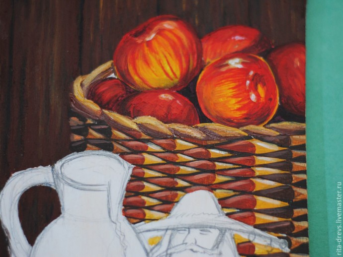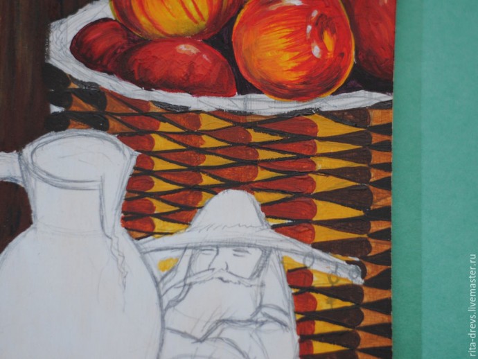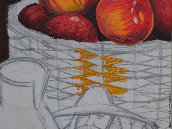 Верхнее плетение корзины закрашиваем охрой. Внизу кладём сиену, а вверху — охру с белилами. Всё это должно смешиваться в процессе, поэтому, если не получается сделать быстро, работаем кусочками.