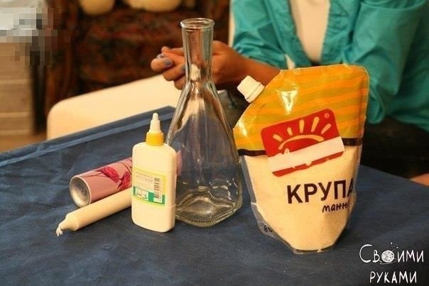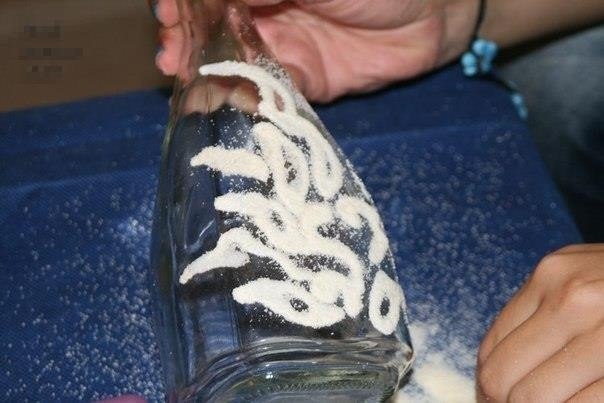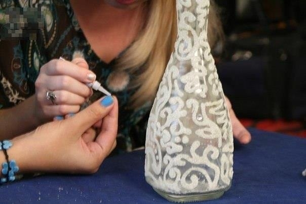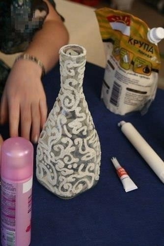 Клей ПВА бывает разной густоты. Если наносить рисунок понемногу и сразу засыпать крупой, то клей не потечёт. Особенно если бутылку сразу класть на батарею отопления (я лично всякое декорирование сушу на електрообогревателе. Очень быстро подсыхает. Однако то, что я вижу здесь - ПВА на стекло, сверху - лаком для волос... Такую вазу не помоешь! Может акриловый клей попробовать. И то не уверена, что ПВА на стекле водой не размочится. Можно попробовать крупу сыпать на акриловый лак.