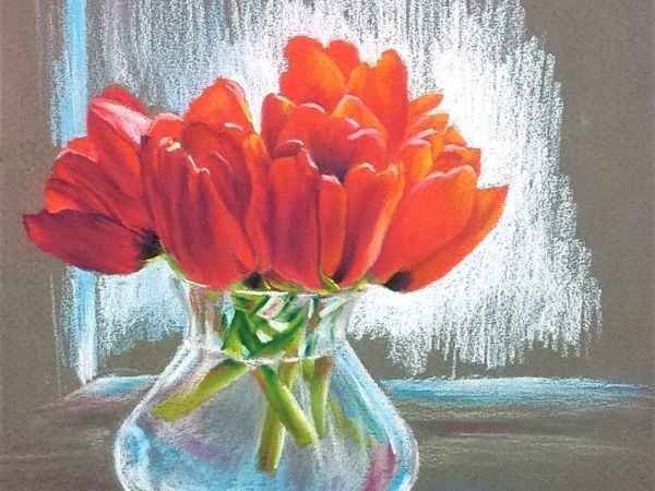 Весенний натюрморт с красными тюльпанами на окне: рисуем пастелью