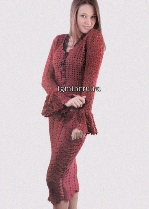 Вам потребуется: 700 г бордовой пряжи (400 г для жакета и 300 г для юбки) «Лиза» (15% шерсть, 35% ангора, 50% акрил, 294 м/100 г); крючок № 3; узкая атласная лента черного цвета.