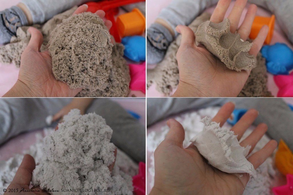 Все, кинетический песок своими руками готов, можно приступать к лепке. Песочек руки пачкает умеренно и не пачкает все вокруг. Куличики держат форму.
