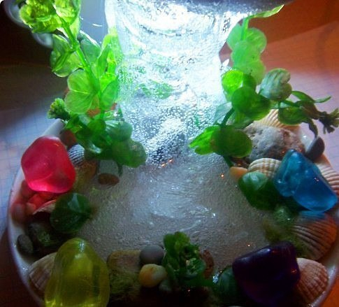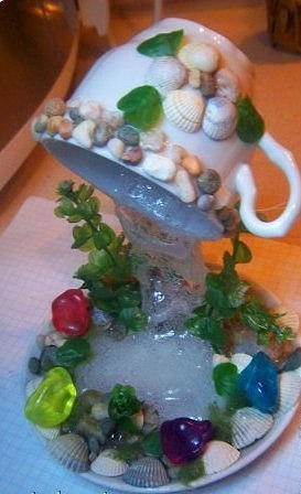 Все понятно: сплавили 2 части бутылки прозрачной (над любым источником тепла - хоть над газовой конфоркой), клеем (похоже на клей для потолочных плит и плинтусов) приклеили кружечку к "воде" и "воду" к блюдцу и его же залили между 2- мя частями бутылки (видите, там внутри пузырьки) , украсили ракушками. Подсветку можно вытащить из любой игрушки. Ну я так думаю;-)