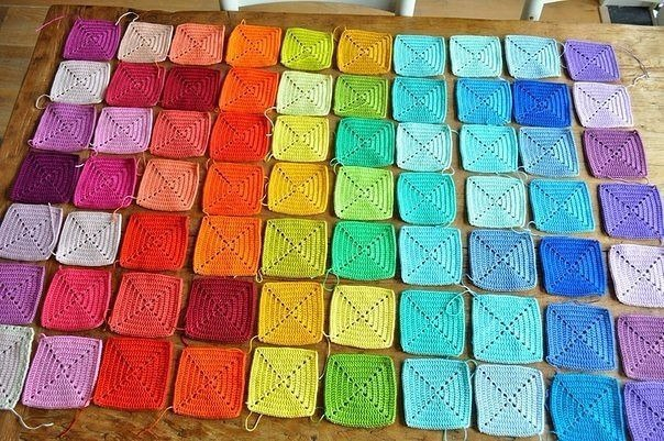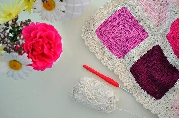 А я вяжу полностью весь квадрат с белой обвязкой. а второй сразу привязываю к первому.Можно через две или три петли.как вам удобно.Так быстрее и удобнее.Когда я вяжу бабушкиным квадратом.то всегда так делаю и узор лучше представить.