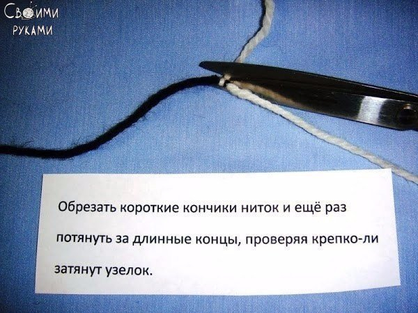 Промышленный узелок - способ крепкого, незаметного соединения ниток. Узел получается маленьким и незаметным. Если нитки шерстяные или хлопковые, кончики нитей можно и не обрезать, а вправить в полотно. Они не выскользнут. А при вязании вискозой, шелком, нейлоном и другими упругими и скользкими нитками места их заправки очень заметны, и кончики выскальзывают, а узелки от движения полотна норовят развязаться. Поэтому узелки должны быть особым образом затянуты, чтоб не ослабевали и не развязывались. Этот узелок хорошо держится и легко вяжется на пальце.
