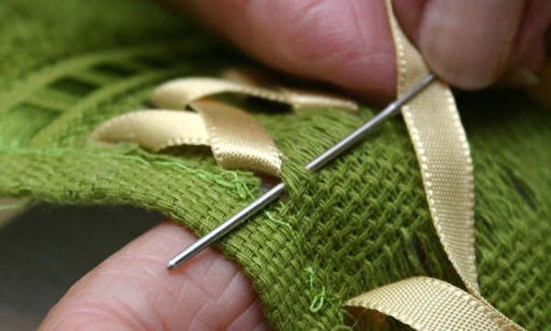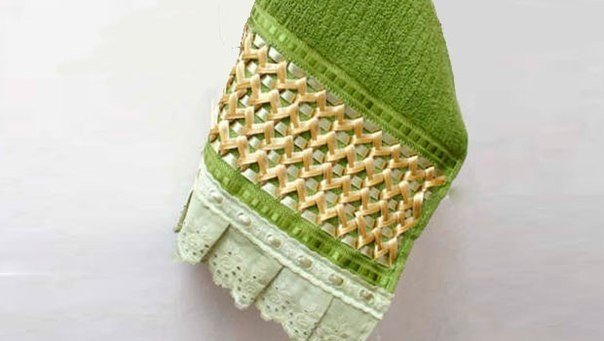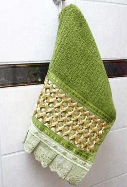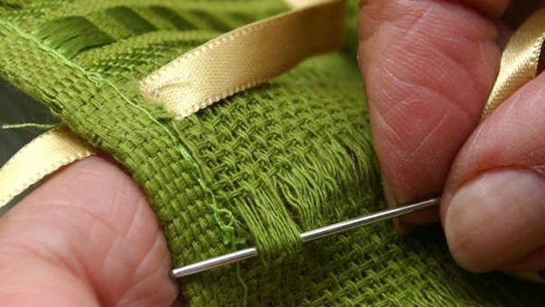 Нина, сначала выдёргиваете нити из полотенца, а потом швом "козлик" протягиваете ленты.