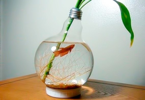 Зачем же так над рыбкой издеваться, растение не водное, и лампочка маленькая?