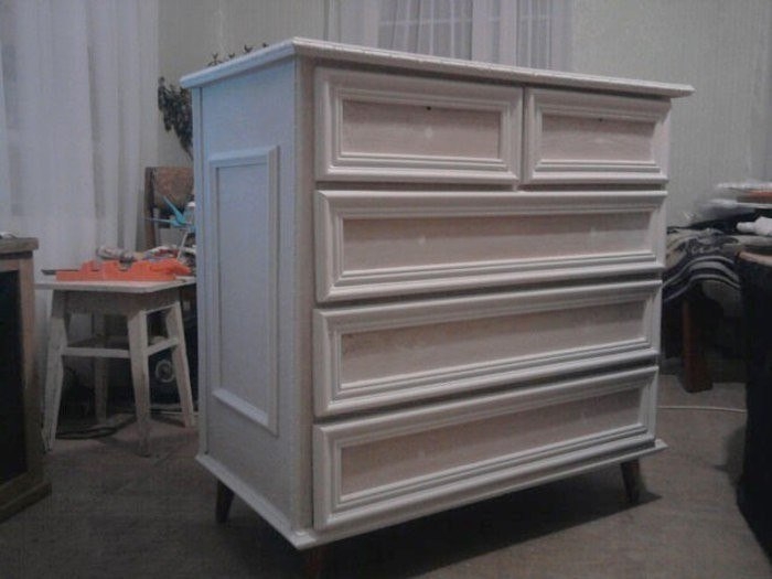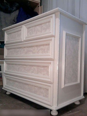 А по-моему все понятно- ошкурили, шлфмашинкой или руками, потом приклеили деревянные молдинги по периметру всех ящиков, потом покрасили и приклеили декоративное покрытие (скорее всего обои) в центре ящиков, прикрутили ручки...