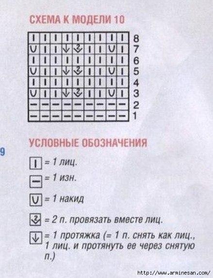 Условные обозначения: треугольник с наклоном вправо - 2 п вместе лиц,с наклоном влево - 1 п снять,след. петля лицевая и надеть на неё снятую петлю. Три штриха соединённые - 3 п. вм...
