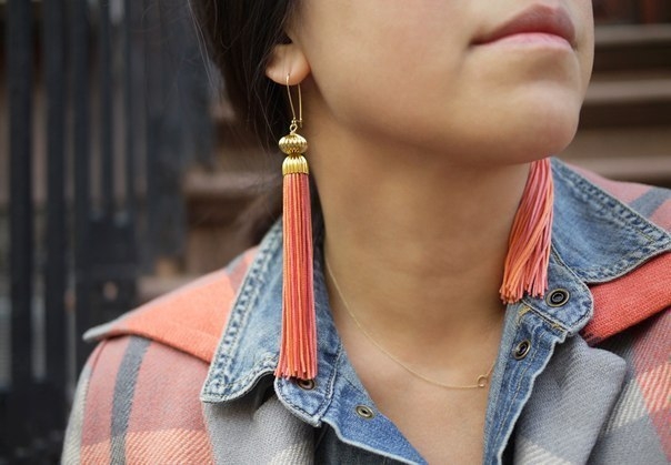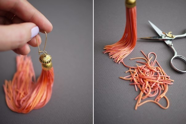 Стильные серьги-кисточки из нитокСтильные серьги-кисточки из ниток остаются актуальными который год.Вы можете сделать их идеально в тон наряду.