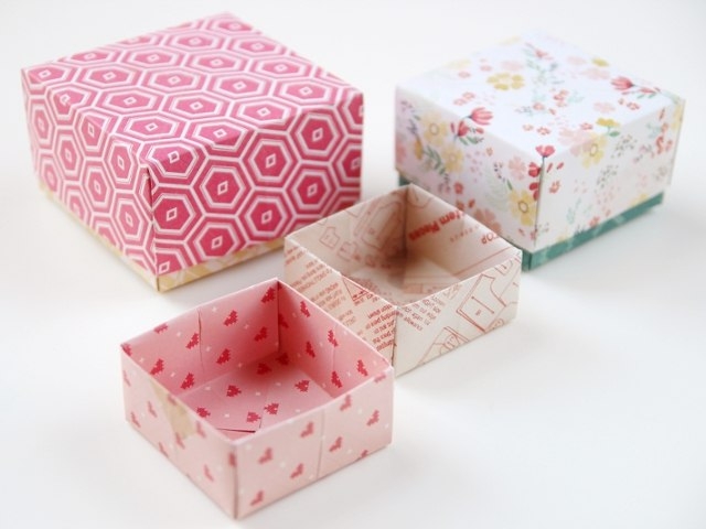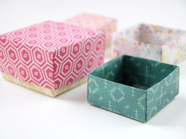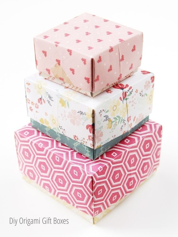 Коробочки в технике оригамиКоробочки в технике оригами, сделанные из красивой упаковочной бумаги - отличный вариант, чтобы красиво преподнести подарок.
