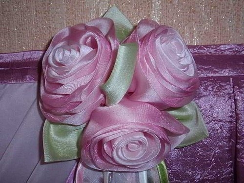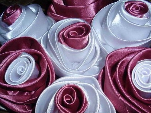 Букет состоит из цветов и бутонов, окруженных несколькими листьями. Розы изготавливают из полос ткани, выкроенных по косой нити и затем собранных в форме витков. Бутоны собираются так же , как цветы, но из более коротких и поплотнее собранных лент ткани. Чтобы придать цветам из ткани и листьям объемность, между полосками ткани можно вставить синтепон. Каждый листок можно украсить прожилками (машинной строчкой), что придаст им большую натуральность.