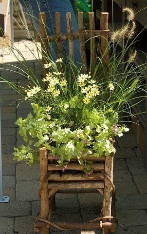 Прекрасная клумбаНеобычный подход к украшению участка реализовывается благодаря ненужным старым ящикам.