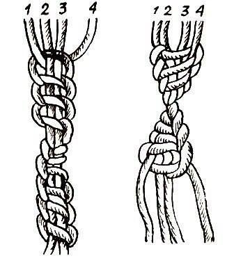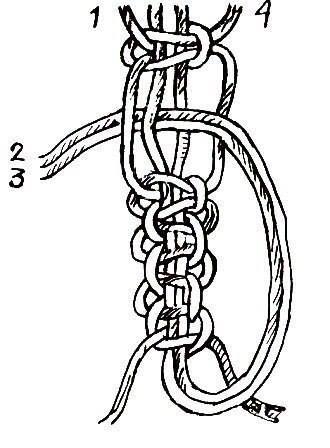 10. Узор «шахматка». Закрепляем на основе 6 нитей. Имеем 12 концов. Делим нити по 4 на 3 группы. Ведем счет слева направо: