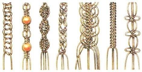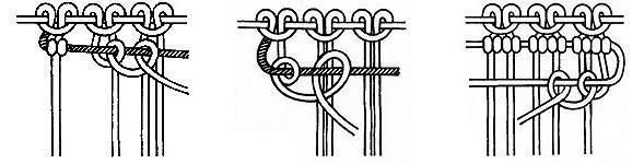 15. Наращивание нити. Рабочая нить примерно в четыре-пять раз длиннее нерабочей. Нерабочая, повторюсь, равняется длине изделия, плюс оформление края. Чтобы не работать с длиннющими концами, можно наращивать нити в процессе работы. Новую нить подкладываем к старой, плетем вместе двумя, но узел затягиваем настолько сильно, чтобы не чувствовалось присутствие второй нити. Одинаковые узлы должны быть одинаковыми по размеру. Когда старая нить заканчивается, продолжаем плести новой. Если нужно заменить сразу несколько нитей, поступаем следующим образом: новую нить сгибаем пополам, перекидываем под нити основы, и завязываем рабочими нитями квадратные узлы. То, что торчит, аккуратно обрезаем, и продолжаем работу.