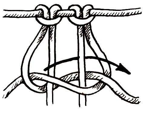 13. «Брида». Навешиваем на основу три нити. Имеем 6 рабочих. Левой рукой делаем двустороннюю петлю, затем вторую и затягиваем. Конец нити ведем вниз. Затем тот же процесс следующей нитью. И так до конца. Так у нас образовалась брида горизонтальная вправо. Для бриды влево тоже повторяем в зеркальном отражении.