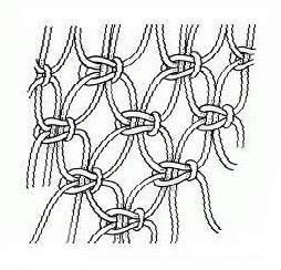 14. Еще распространенный узор, брида наклонная. Для того чтобы добиться такого эффекта, достаточно всего лишь первую нить повести не ровно, а под углом, и зафиксировать это положение булавкой. На фото показано несколько рядов таких узлов. Брида позволяет выполнять разные геометрические узоры.