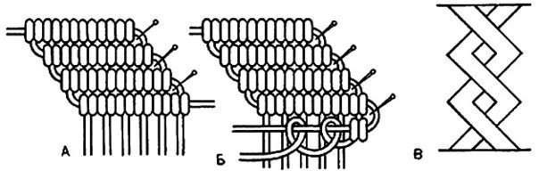 11. Узор «шахматка» на уголок. Он получится, если мы в каждом ряду оставляем непроплетенными две крайние нити. Тогда в каждом ряду на один узел будет меньше, в четвертом ряду выполняется только один узелок. По бокам – четыре свободные нити.