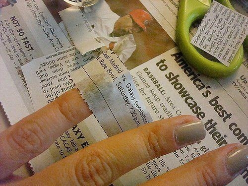 4. Вырежьте маленькие кусочки бумаги, газеты (достаточно большие, чтобы полностью покрыть ноготь).