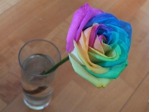 пищевыми красителями ,но дайте недолго розам постоять без воды ,а потом сделайте надрезы и ставте в в емкость с красителями сразу как надржите. Цветок захочет пить и окрасится красками (лу4ше красители с теплой водой )
